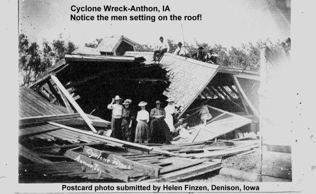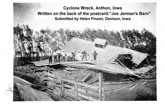 photo #31:This postcard has "Cyclone Wreck, Anthon, IA" on the front of it. Written on the back of the postcard it says: Joe Jerman's barn. I believe it is the same barn that is in photo#28. Does anyone know where Joe Jerman's lived? East, north, south, or west of Anthon?