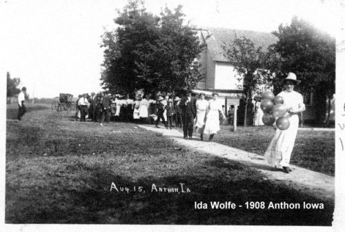 photo #30:Postcard says on the front: August 15, Anthon, IA the name Ida Wolfe and the date 1908 are written on the right hand side of the postcard. Wonder what kind of church function everyone had attended that would have had balloons? Nice to see trees near the building - which I wonder if it is the old Catholic Church. Anyone know for sure?