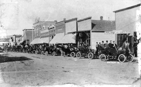 PHOTO 64: Main street of Anthon Iowa - looking towards the west at the north side of the street. Notice what looks to be a wooden walk-way across the street towards the front of the photo. Look at the old cars on Main street too! This photo was shared with us by LYNN (MEYER) McCORMICK of Anthon, Iowa.